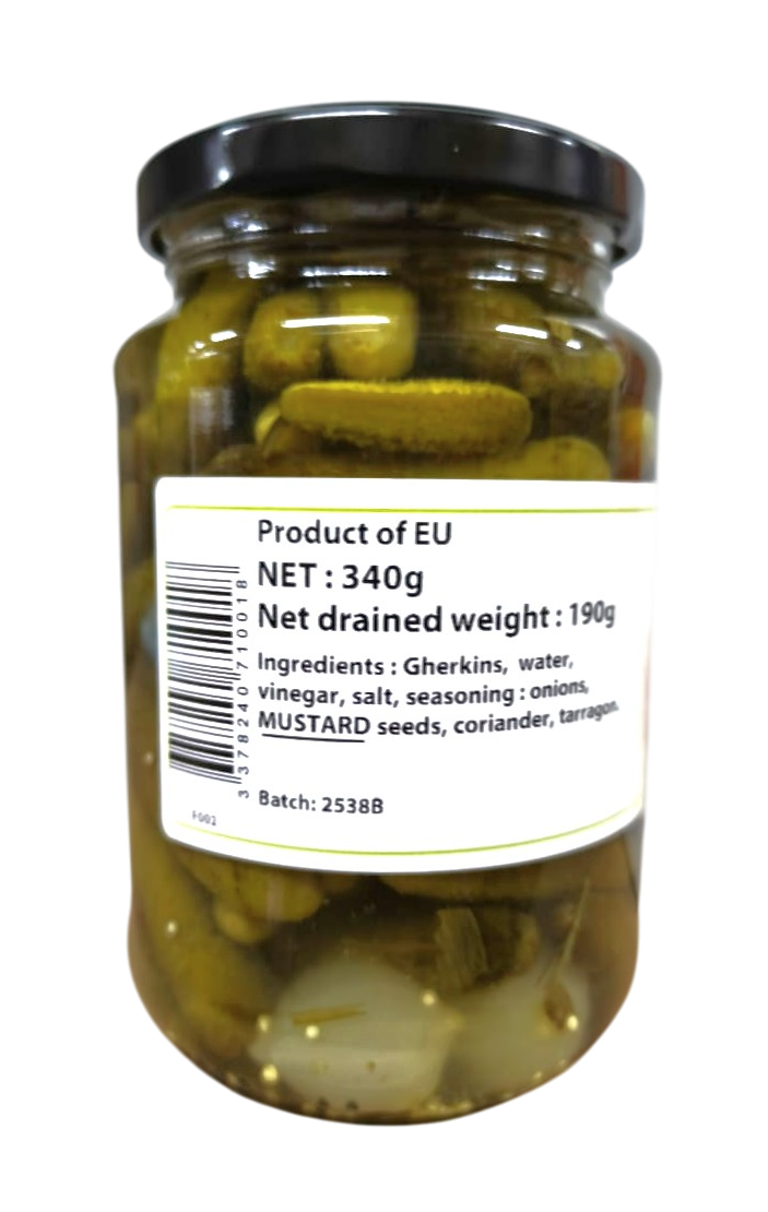 Ingredients: Gherkins, water, vinegar, salt, seasoning: onions, Mustard seeds, coriander, tarragon